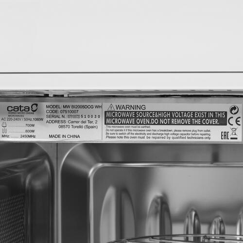 Внутренняя камера Cata MW BI2005DCG WH обладает емкостью 20 л и покрытием на основе долговечной нержавеющей стали. На фронтальной панели расположены цифровой дисплей, сенсорная панель и поворотный механизм управления. В наборе предусмотрены стеклянный поддон и решетка для приготовления на гриле.