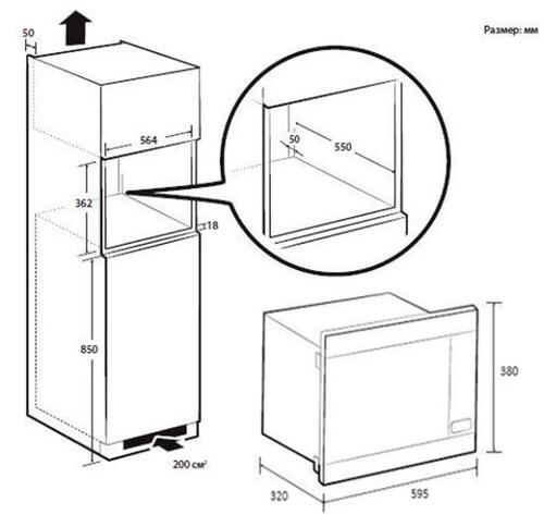 Микроволновая печь оснащена удобным дисплеем, сенсорным управлением и функцией таймера на 1 час 39 минут. Имеется надежная защита от детей. Навесная дверца открывается с кнопки и дополняется звуковым оповещением. Оборудование весит 15.5 кг и обладает габаритами 59.5x38x32 см.