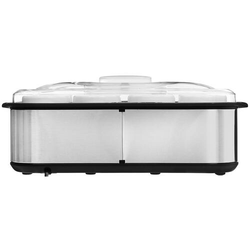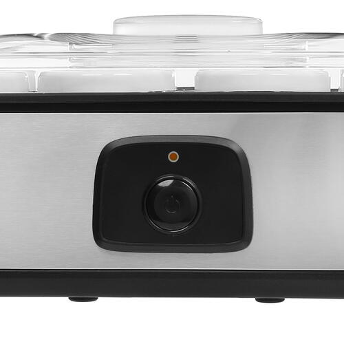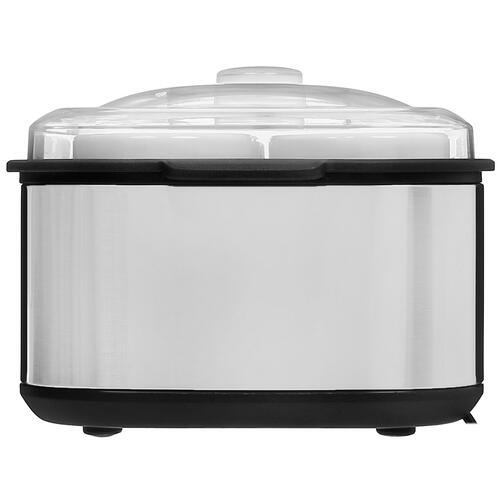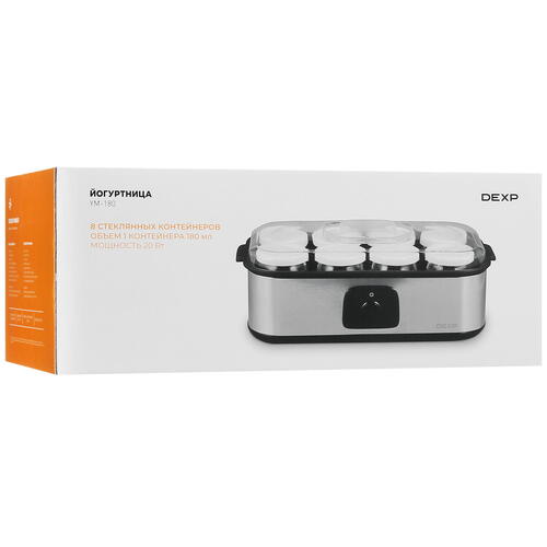 Йогуртница DEXP YM-180 представлена в серебристом корпусе из металла и стекла. 8 банок с крышками подходят для приготовления десерта порциями по 180 мл. Стеклянные емкости не впитывают запахи еды и не требуют сложного ухода.