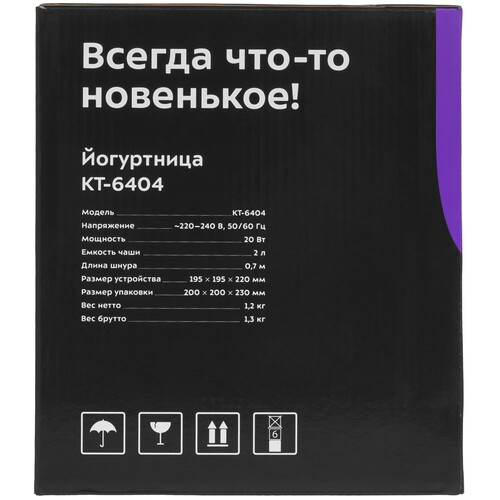 Йогуртница Kitfort КТ-6404 мощностью 20Вт, отличается простым и удобным управлением. Длина шнура составляет 0.7 метра.
