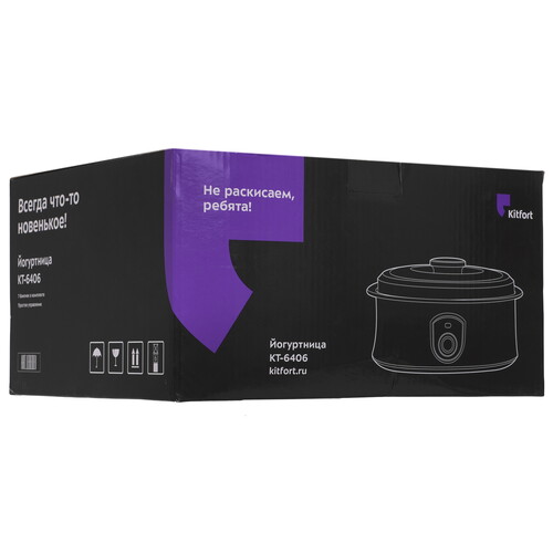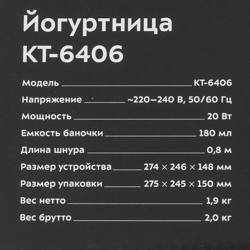 Йогуртница Kitfort KT-6406 в пластиковом корпусе белого цвета имеет 7 емкостей, объем каждой из которых составляет 180 мл. Доступ к параметрам производится через кнопочную панель управления.