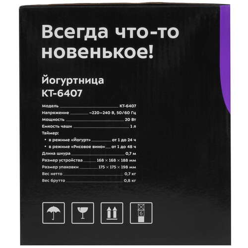Йогуртница Kitfort КТ-6407 мощностью 20Вт, отличается простым и удобным управлением. Имеет 2 программы приготовления - йогурт и рисовое вино. Длина шнура составляет 0.7 метра.