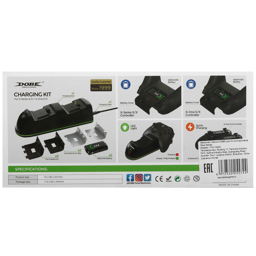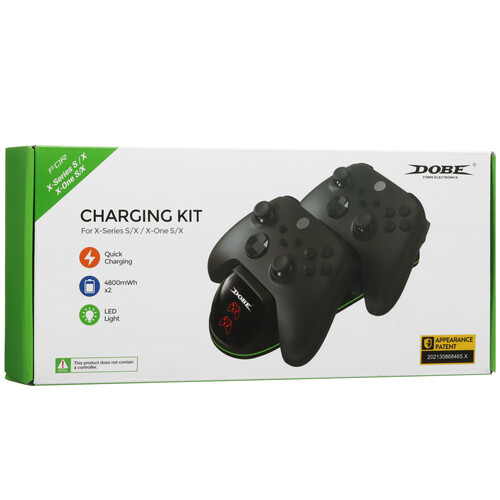 Charging kit TYX-1623X — это зарядная станция Dobe для двух геймпадов Xbox One, Xbox Series S и Xbox Series X. Станция оснащена двумя аккумуляторами ёмкостью 4800 мАч каждый.
