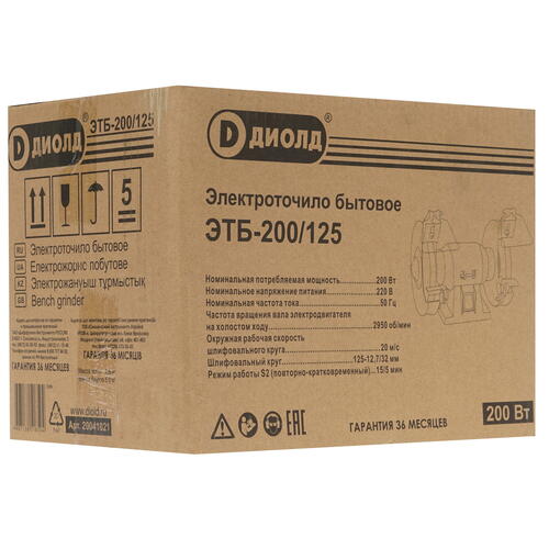 Весящий 4.6 кг точильный станок Диолд ЭТБ-200/125 получает необходимую для своего функционирования электроэнергию от бытовой электросети с напряжением 220 В и работает с уровнем шума, не превышающим 96 дБ. Устройство, оснащенное защитным кожухом, использует систему воздушного охлаждения кругов. Модель обладает мощностью 200 Вт, благодаря чему за минуту ее непрерывной работы точильный круг совершает до 2950 оборотов вокруг своей оси, обеспечивая быструю заточку режущих кромок.