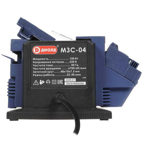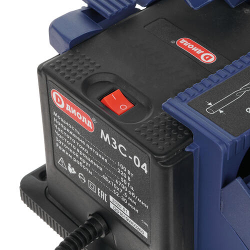 В основе станка Диолд МЗС-04 лежит двигатель мощностью 100 Вт, который обеспечивает скорость вращения круга до 6700 об/мин. Конструкция точильного станка предусматривает наличие круга диаметром 48 мм и толщиной 7.5 мм. На него монтируются шлифовальные круги для заточки с поддержкой посадочного диаметра 10 мм.