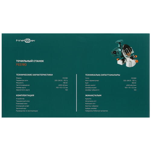 Точильный станок FinePower FES180 применяется для заточки сверл, зубил, лезвий, ножей, ножниц. Он оборудован одним точильным кругом диаметром 100 мм, который обеспечивает высокую производительность благодаря скорости вращения 6300 об/мин. Для работы с деталями предусмотрены стопорный штифт с мерной шкалой, рожковый и торцовочный ключи.