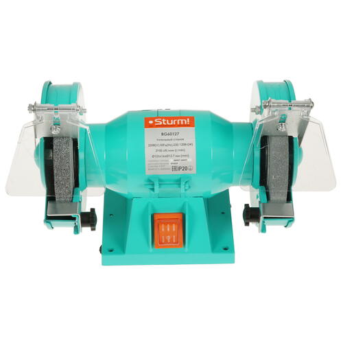 Конструкция станка Sturm! BG60127, обладающего мощностью 230 Вт, предусматривает наличие двух упор, предназначенных для абразивных и алмазных дисков разной зернистости. Искроулавливатели и щитки прикрывают диски, что позволяет защитить оператора от травм. Прозрачная крышка закрывает выключатель, защищая его от пыли. Упоры могут вращаться со скоростью 2950 об/мин. Для работы аппарат использует точильные диски диаметром 125 мм. Модель предусматривает воздушное охлаждение дисков.
